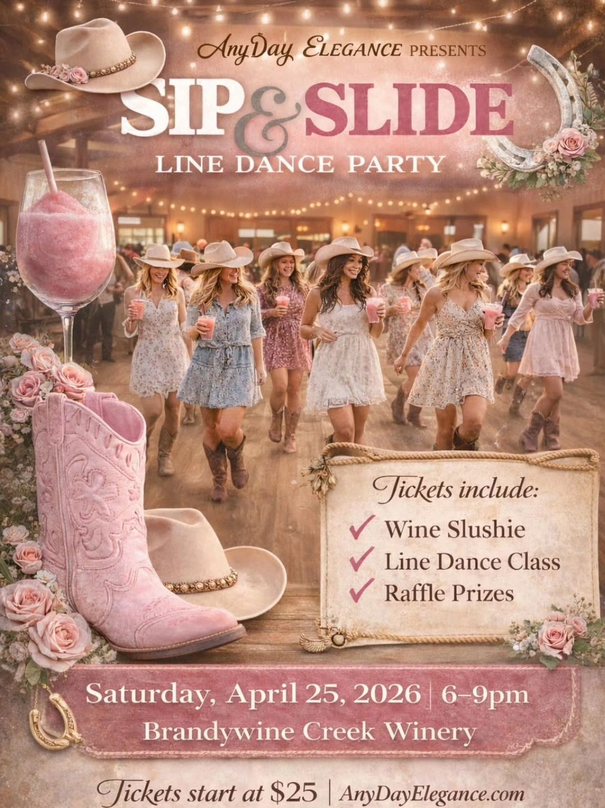 Grab your boots, your besties, and your cowboy hats—it’s time for a night of fun, laughter, and line dancing at the Sip & Slide Line Dance Party!
